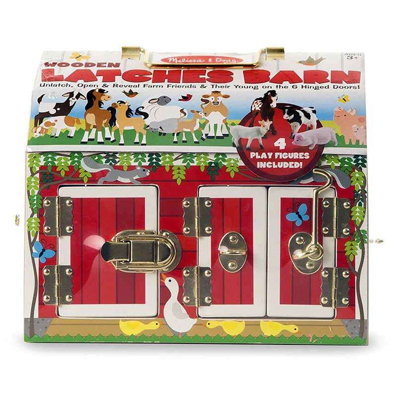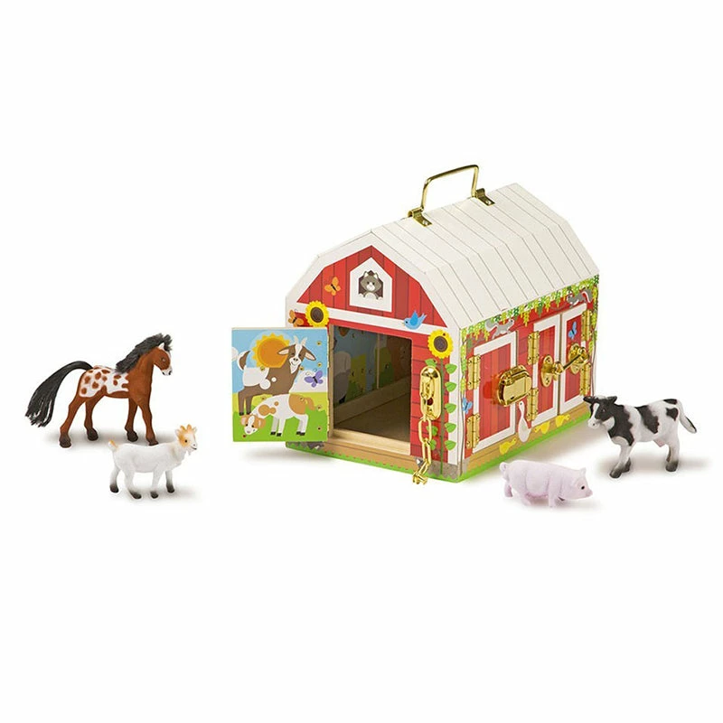 Who is inside the barn today? Unhook the latches to open the barn doors, then close the doors and buckle up the barn again! This beautifully crafted sturdy wooden barn is brightly painted both inside and out. It features six brass-hinged doors with working latches and locks, and pictures of farm animals on the inside of each door. There’s even a brass handle on top to take the fun wherever kids go!
