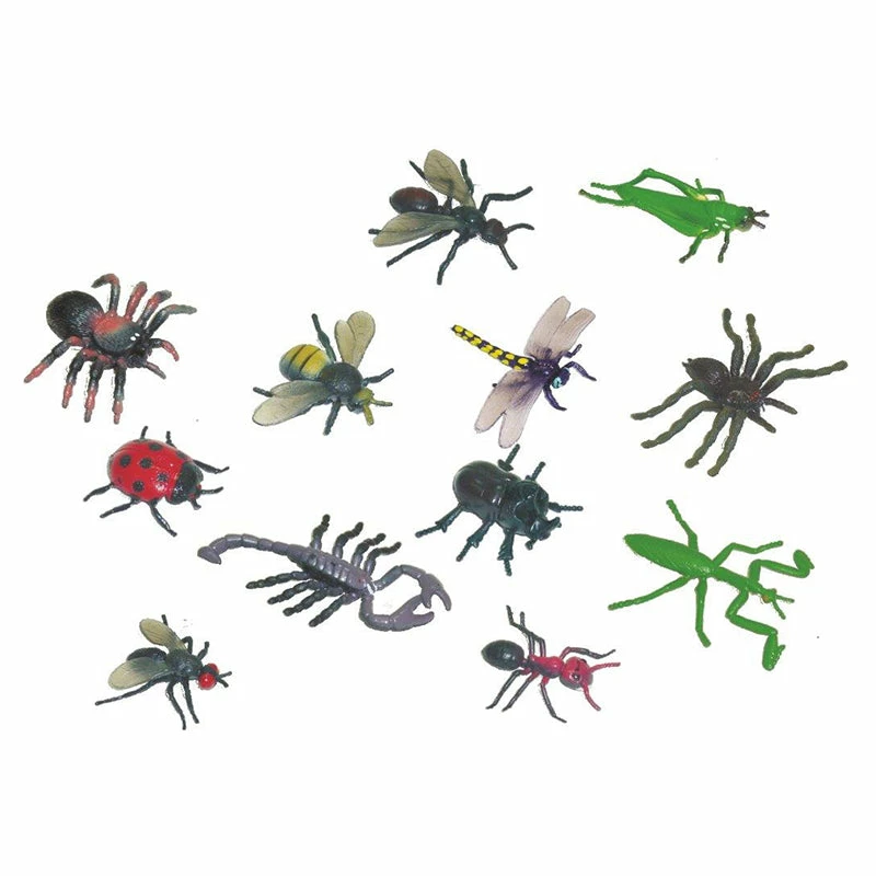 This set of 12 insects come stored in a handy plastic container and complete with a learning guide. The insects included are a ladybird, fly, mosquito, grasshopper, bee, ant, queen ant, scorpion, praying mantis, rhinocerous beetle and 2 spiders. Each insect is approx 5cm x 3cm.