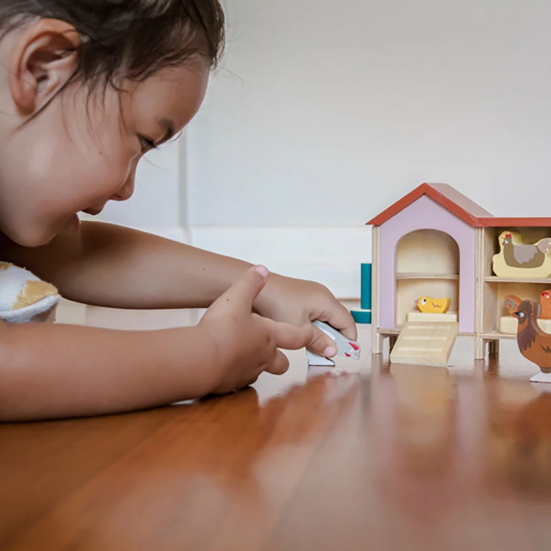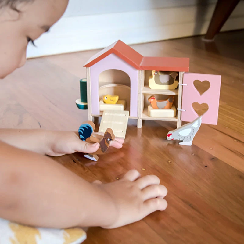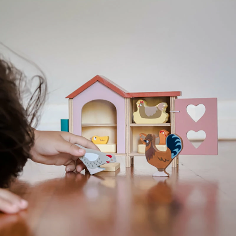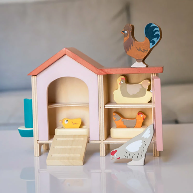 Add this gorgeous wooden chicken coop with chickens to any farm setting or in the yard of your dollhouse. The set includes a chicken coop (17cm x 5.5cm x 12.5cm), a rooster, 2 hens, 2 nests and a feeding trough. All made from high quality rubberwood.