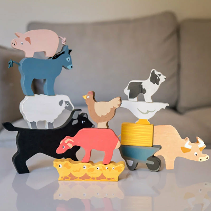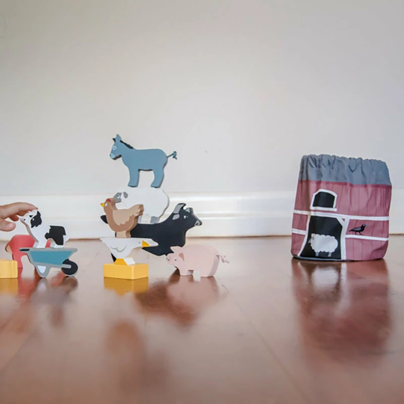 This stacking farmyard set will be adored by all. How high can you stack the animals? Which animal will sit on top? There are 10 farmyard animals included plus a wheelbarrow and hay bale. All can stored in a convenient drawstring bag. All made from high quality rubberwood.